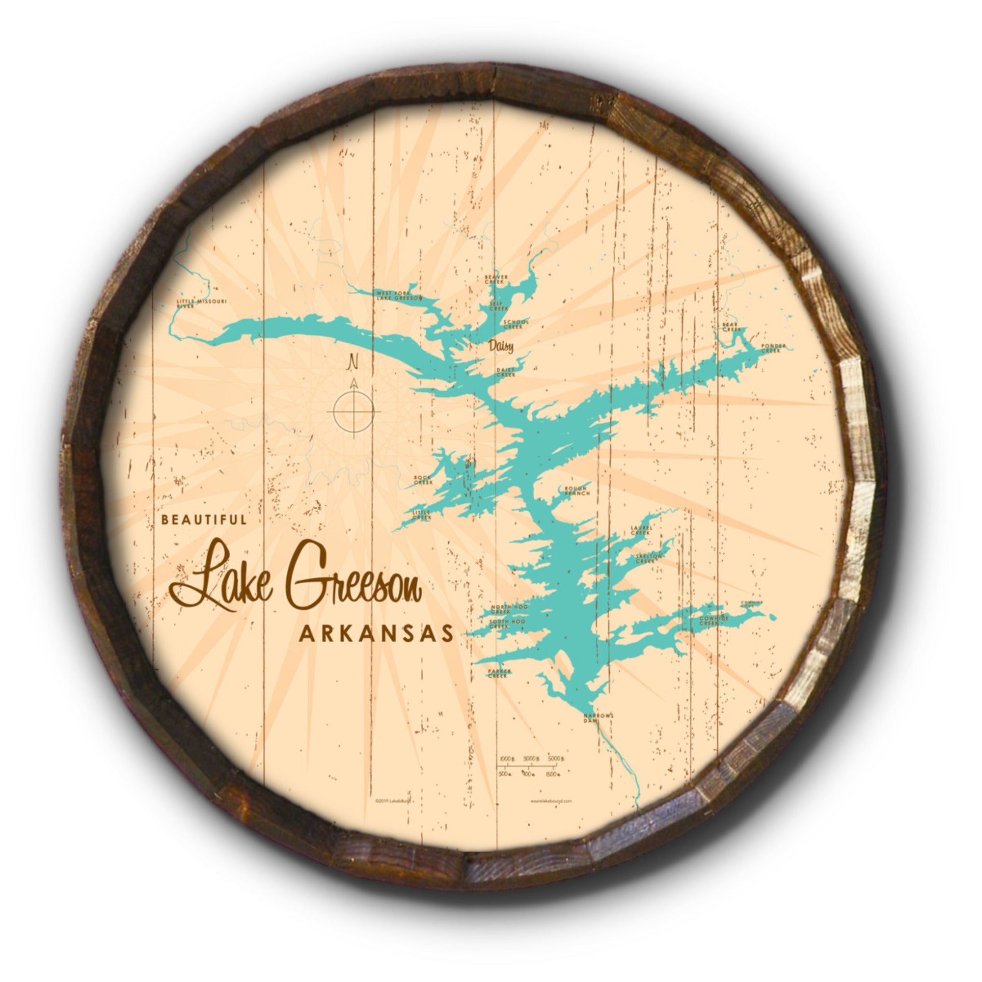 Lake Greeson Arkansas, Rustic Barrel End Map Art – Lakebound®